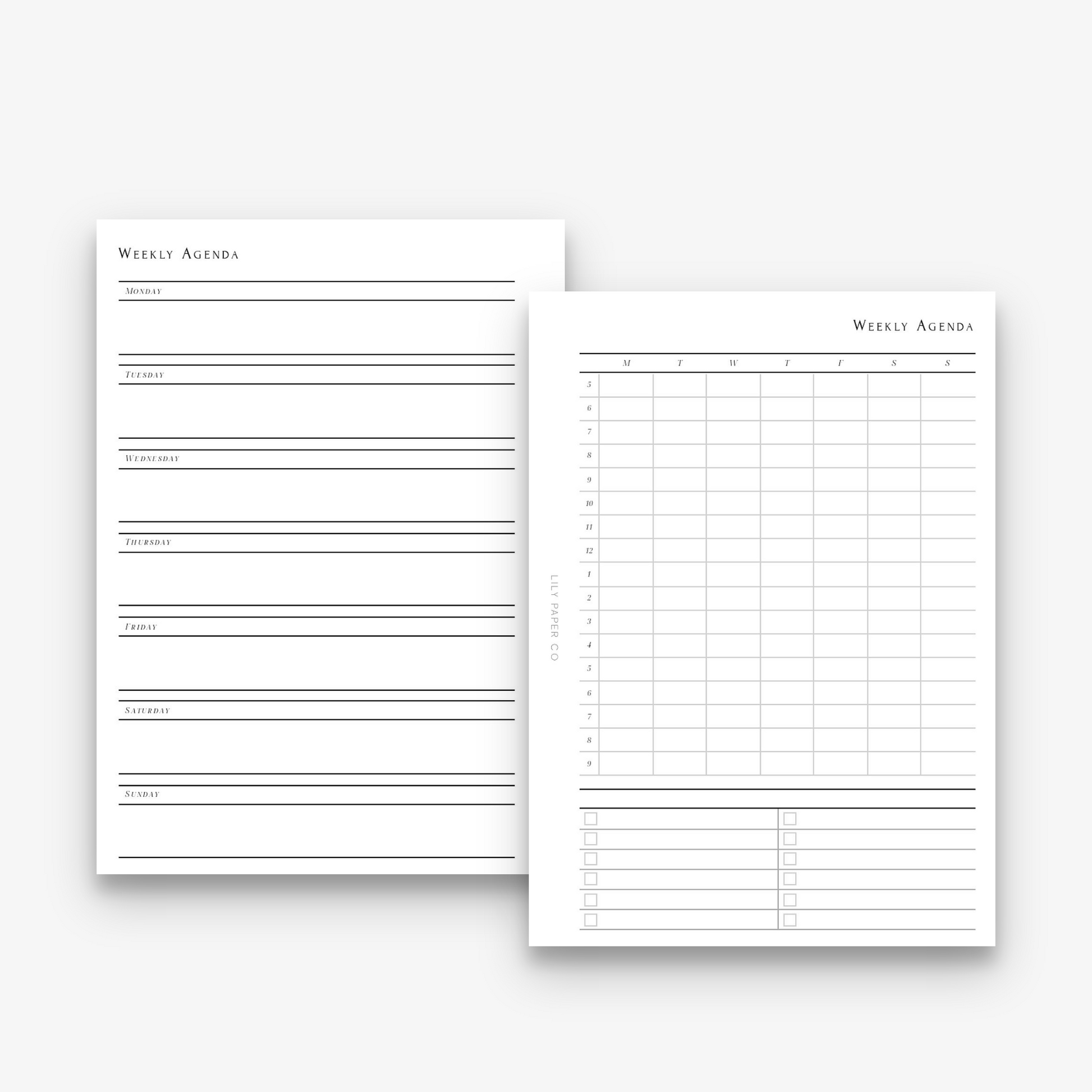 The Weekly Agenda insert features hourly columns across two pages, offering structured space for scheduling appointments, routines, and to-dos. Designed for planners who prefer a balanced blend of structure and flexibility, this layout keeps your days organized and your week in focus.
